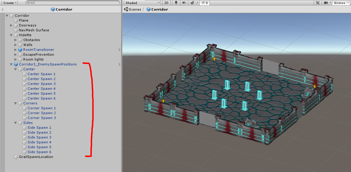These spawn locations are referenced in the Enemy Spawn Settings, along with the amount/types of enemies that can spawn in this room.