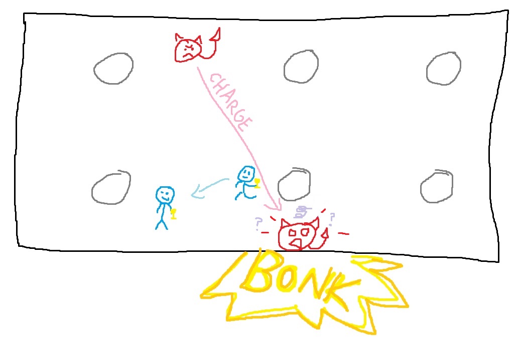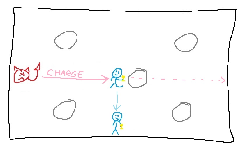 While it’s nowhere near worthy of showing in a GIF yet, I started laying the groundwork for its unique movement-based behavior. The Taurush will charge at the player in a line, forcing the player to dodge out of the way. Two things are important here: the player must be able to evade its attacks, and it should continue past the player until it hits a wall/obstacle. The impact will leave it dazed momentarily, giving the player a chance to attack.