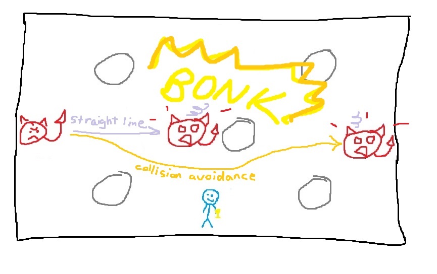 Additionally, it means we can’t use an approach using NavMesh-based collision avoidance, as colliding with obstacles in the level is exactly what we want!